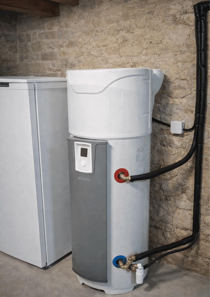 Concrètement, un ballon thermodynamique monobloc réunit une pompe à chaleur intégrée au ballon qui capture des calories de l’air pour la production d’eau chaude sanitaire. Solution compacte et autonome, il se pose facilement dans un local ventilé, idéal en maison ou appartement bien isolé.